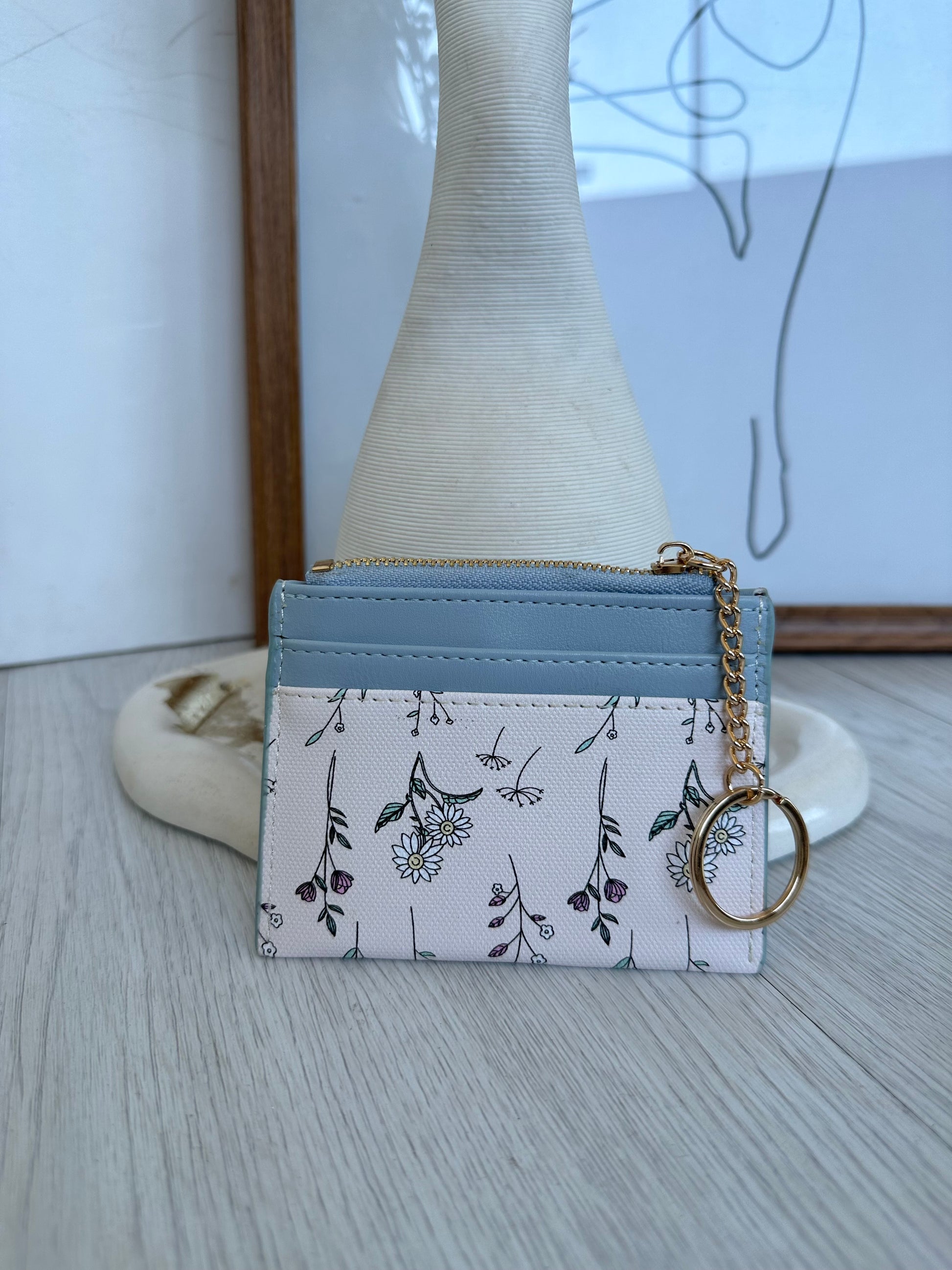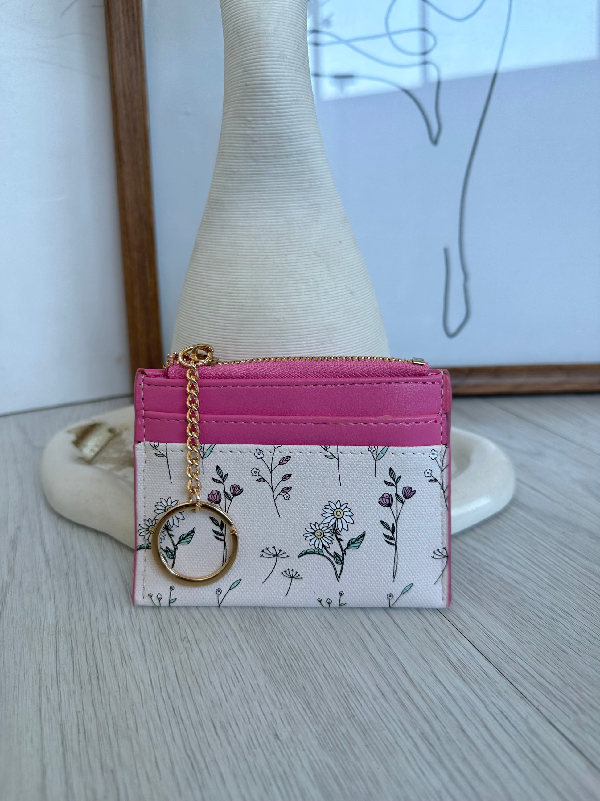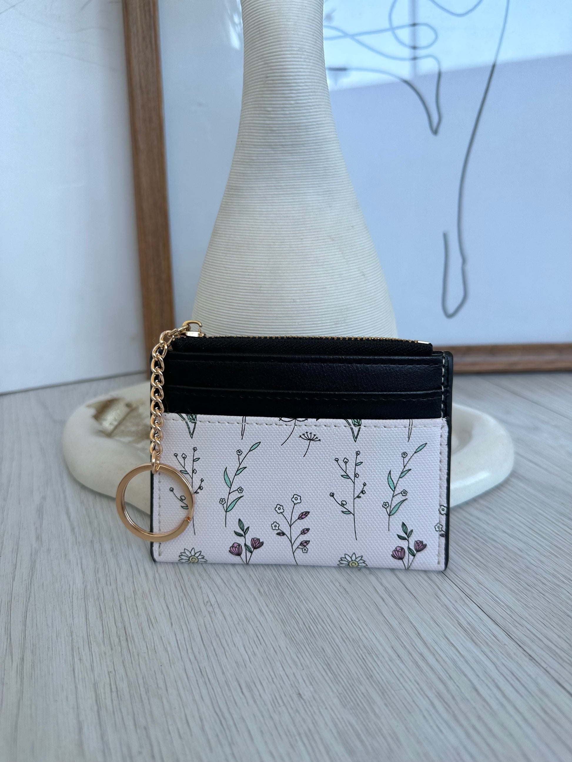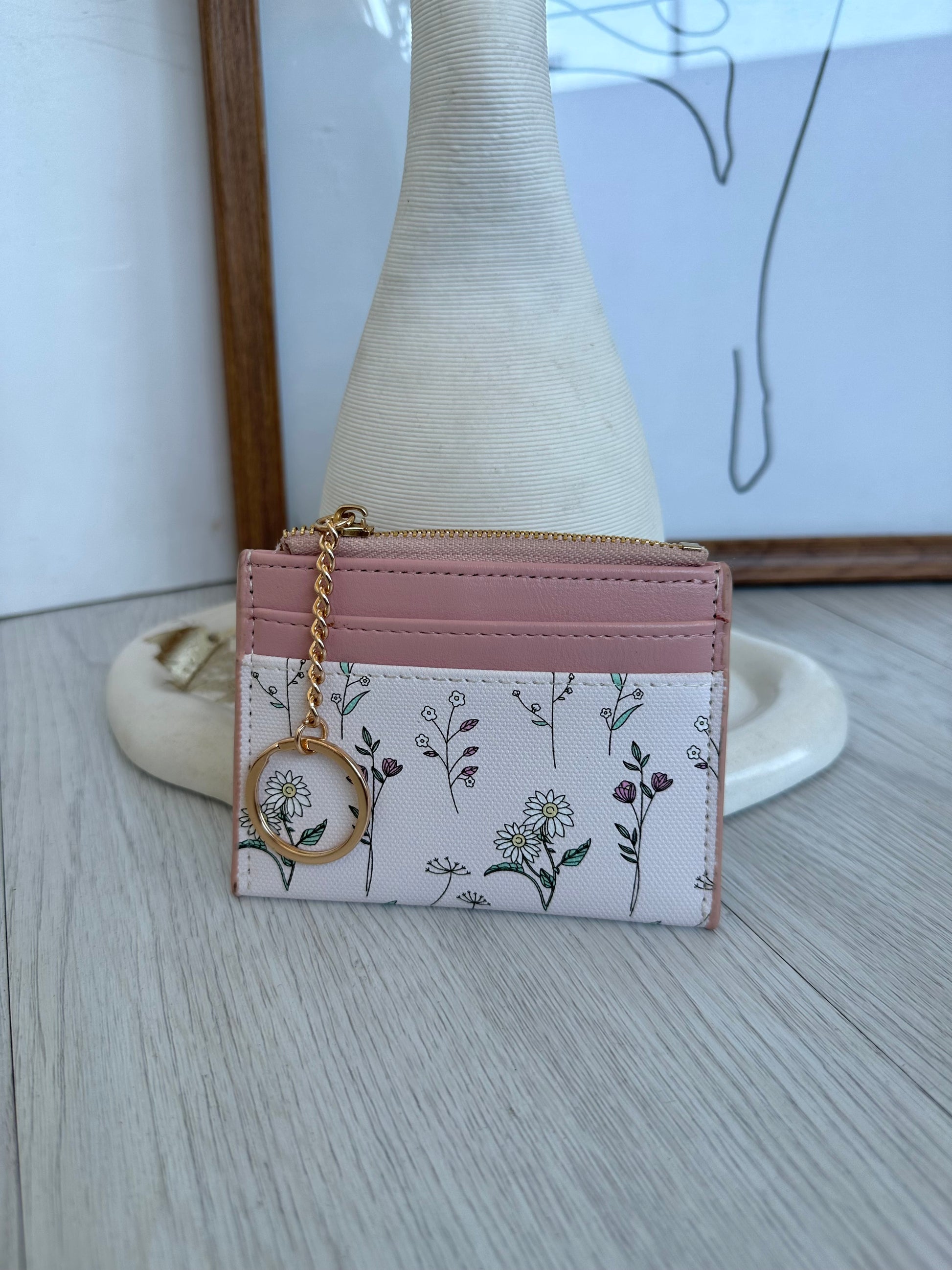 Un tarjetero compacto y lleno de estilo, con un diseño floral delicado combinado con tonos suaves que le da un toque femenino y moderno.